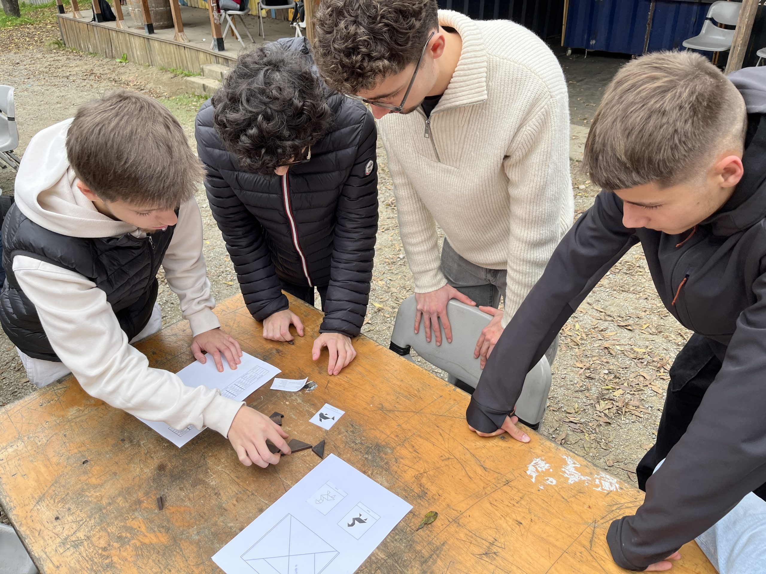 Au programme : le jeu de palets vendéens, le chamboule-prof (une version personnalisée du chamboule-tout avec des photos des enseignants), le tangram (reproduire des formes en équipe), ainsi qu’un défi plus cérébral inspiré du « Certificat d’Études » de niveau 3ème. À la surprise générale, certaines questions, apparemment simples, se sont révélées plus complexes que prévu.