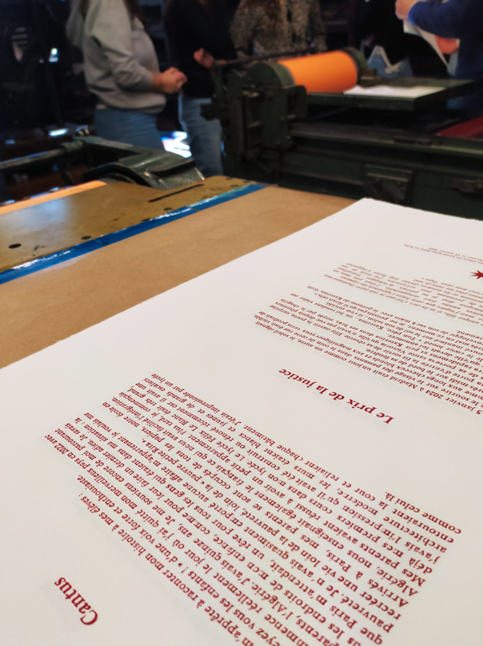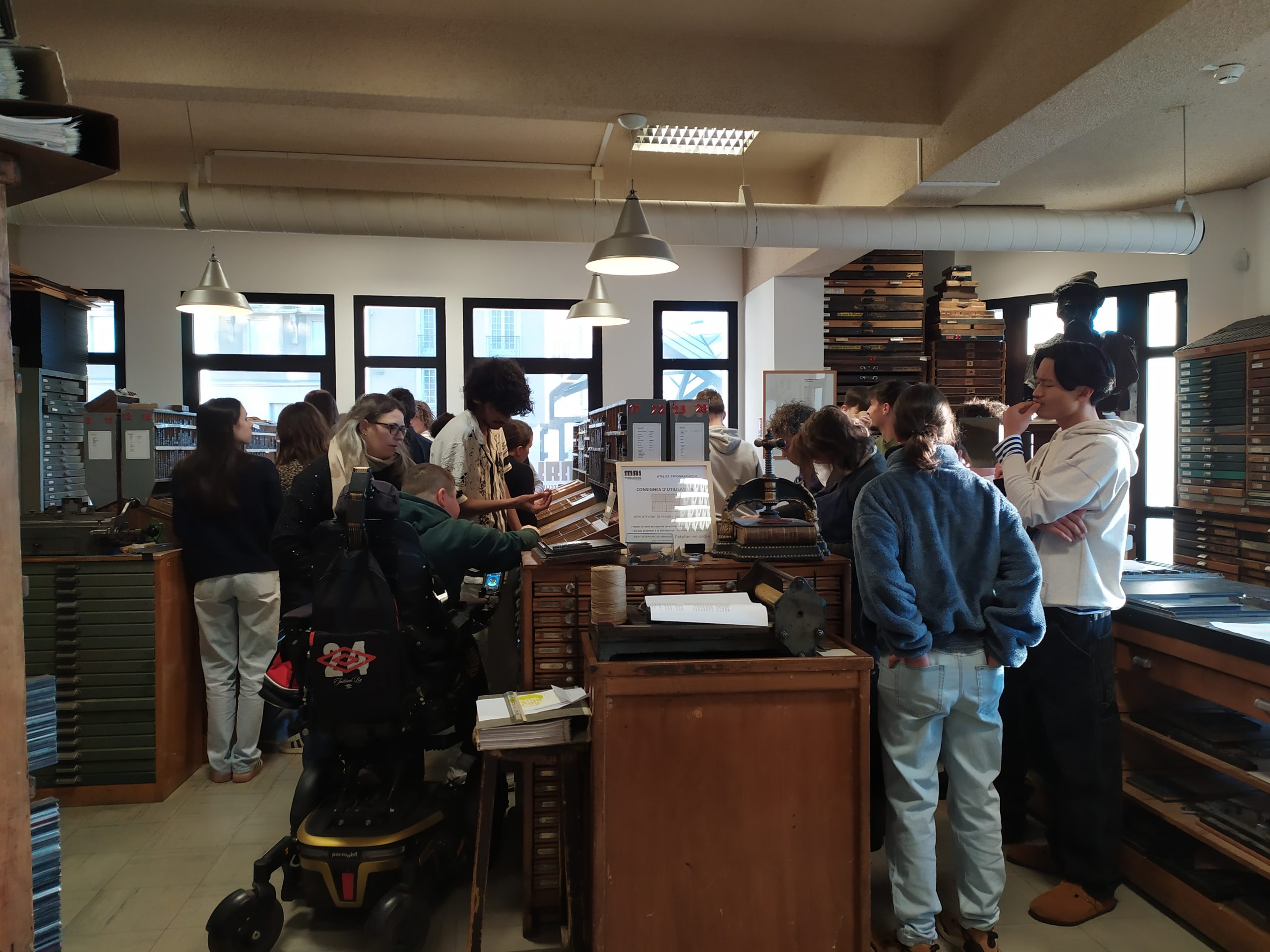Après avoir rencontré et échangé avec M. Coudrais, de la librairie « La vie devant soi » le mercredi 8 Janvier, les TMCVA et les TPCEPC ont pu faire le mercredi 15 Janvier la visite du Musée de l’Imprimerie et réaliser un atelier typographie. Lors de cette visite, les élèves ont patiemment disposé une lettre après l’autre (à l’envers) dans une réglette en métal pour ensuite encrer leur texte et l’imprimer à l’aide d’une presse. Nous avons ensuite découvert le musée à travers l’utilisation de différents types de machine servant à composer le texte et à l’imprimer sur papier. Nous sommes tous repartis avec un magnifique exemplaire de notre texte imprimé sur un papier vélin filigrané. Les élèves se sont montrés très attentifs et intéressés, et ont même été félicités par nos guides !