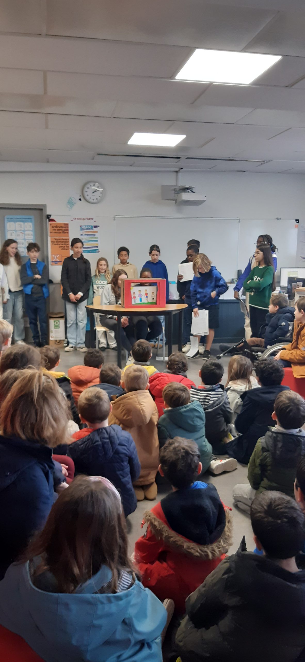 Jeudi, deux classes de cycle 2 ont été accueillies par Myriam Rabard et reçues au CDI pour une lecture de contes écrits et illustrés par des élèves de sixième du collège St Donatien.
