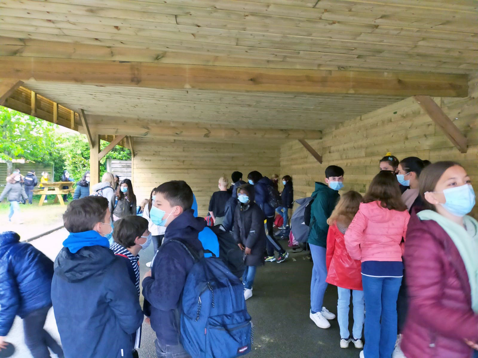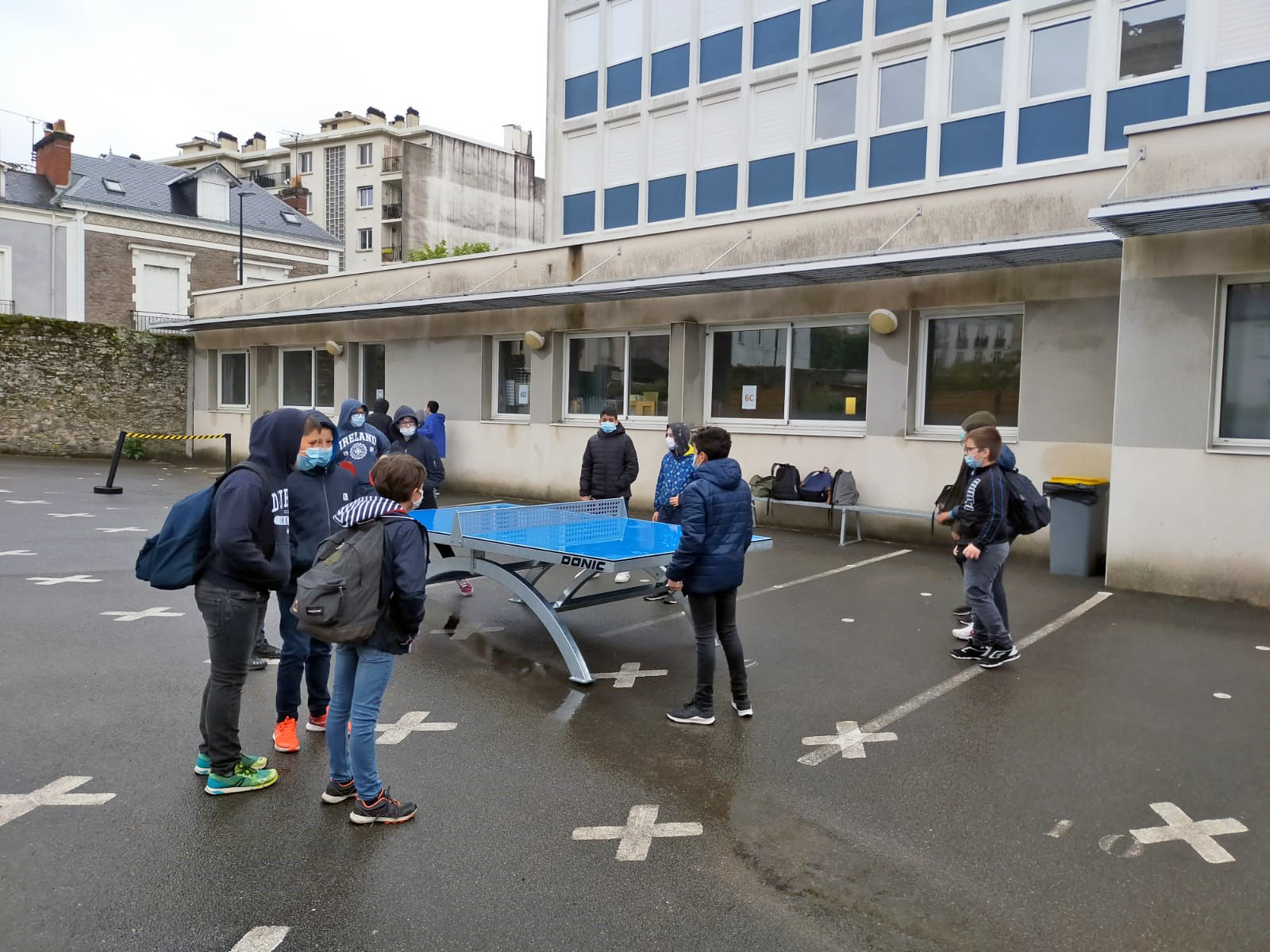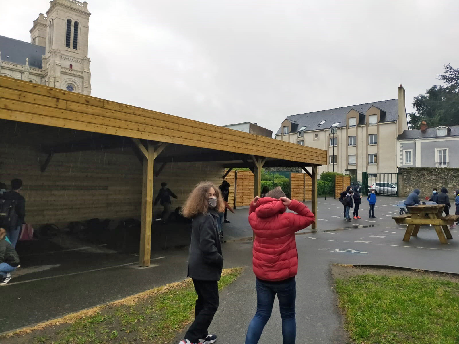 C’est sous la pluie que les élèves de 6e du collège St Donatien ont pu retrouver leur cour de récréation après quelques mois d’indisponibilité étant donné la construction du préau et la livraison retardée de matériel