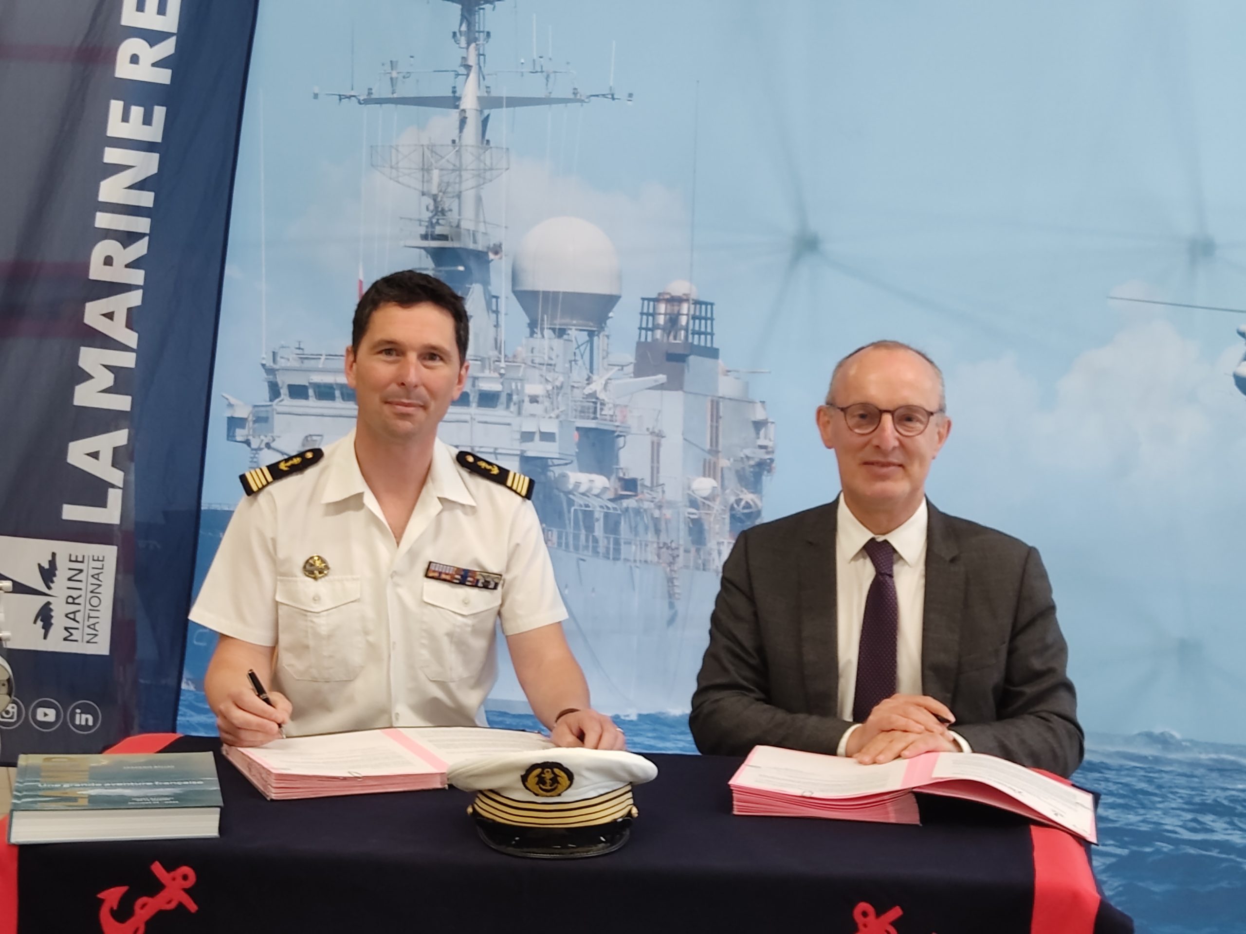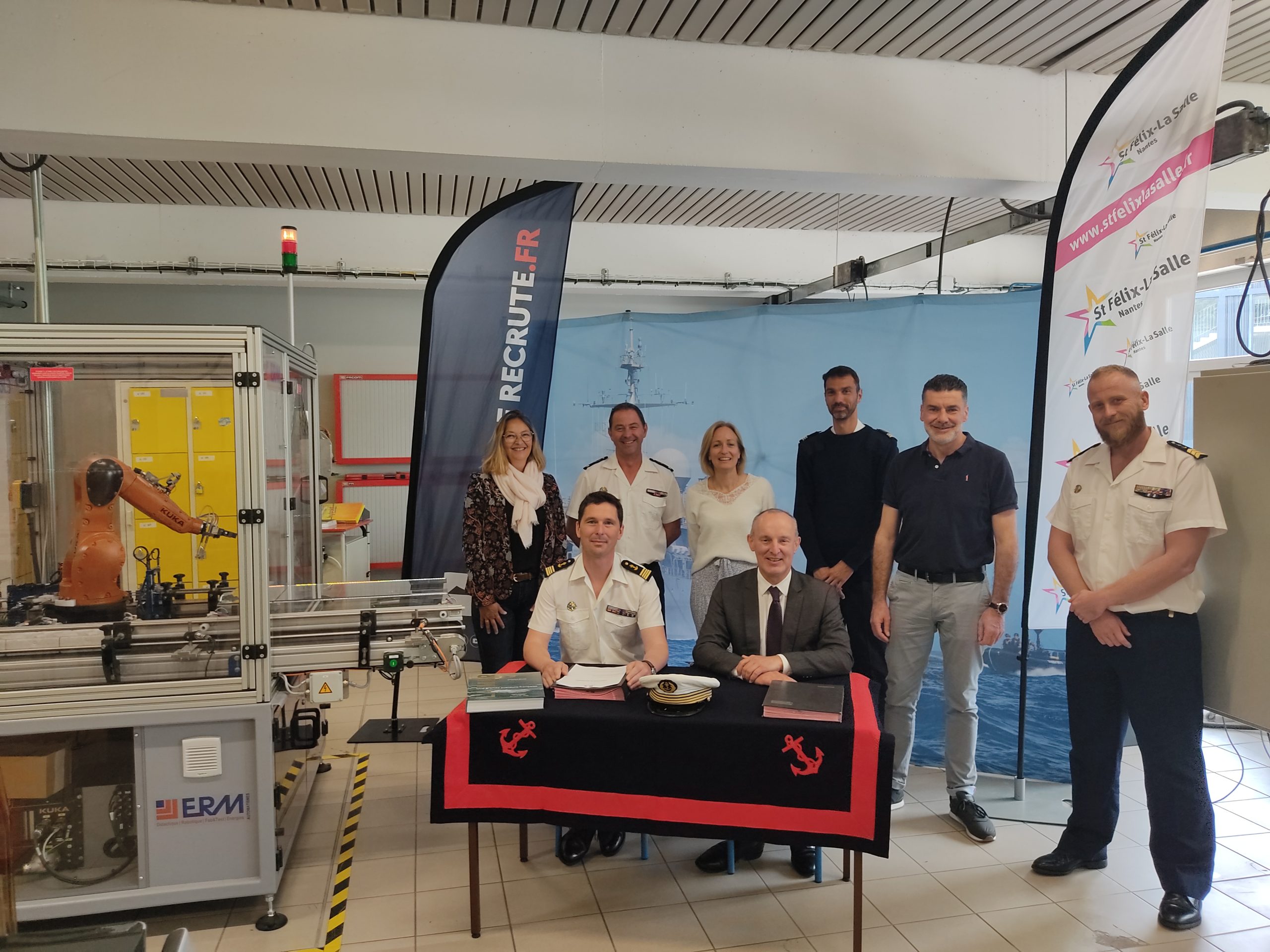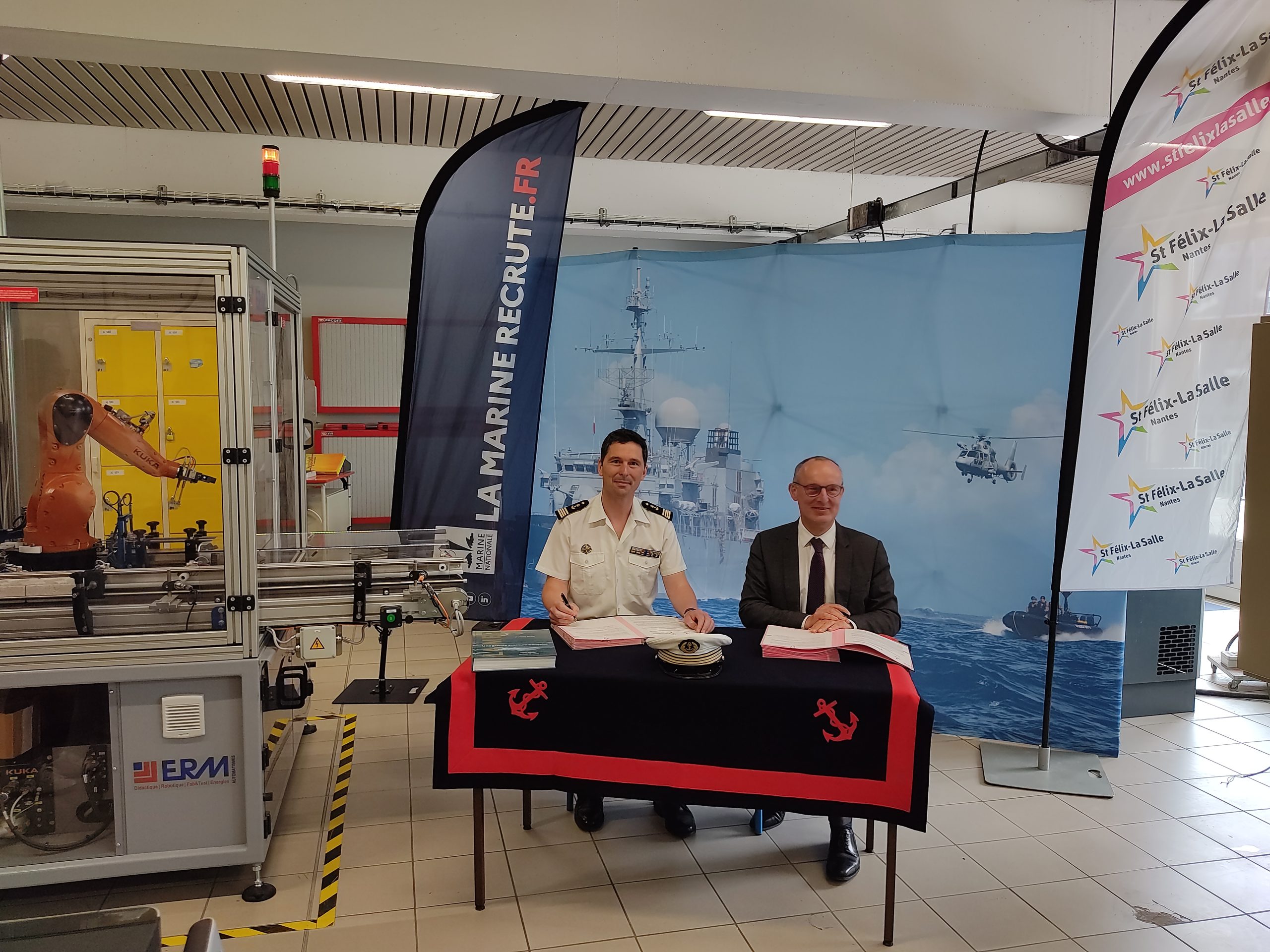 Le Capitaine de Corvette Stéphane BENEZECH, Chef du service de recrutement de la Marine, secteur Ouest et Jean-Philippe THOIRY, Directeur Général de l’Ensemble St Félix-La Salle, ont signé, le mardi 23 mai 2023 à Nantes, une convention de partenariat qui vise à mener des projets collaboratifs entre les deux organismes et à faciliter la présentation des métiers de la Marine Nationale aux élèves, étudiants et apprentis de l’Ensemble St Félix-La Salle.