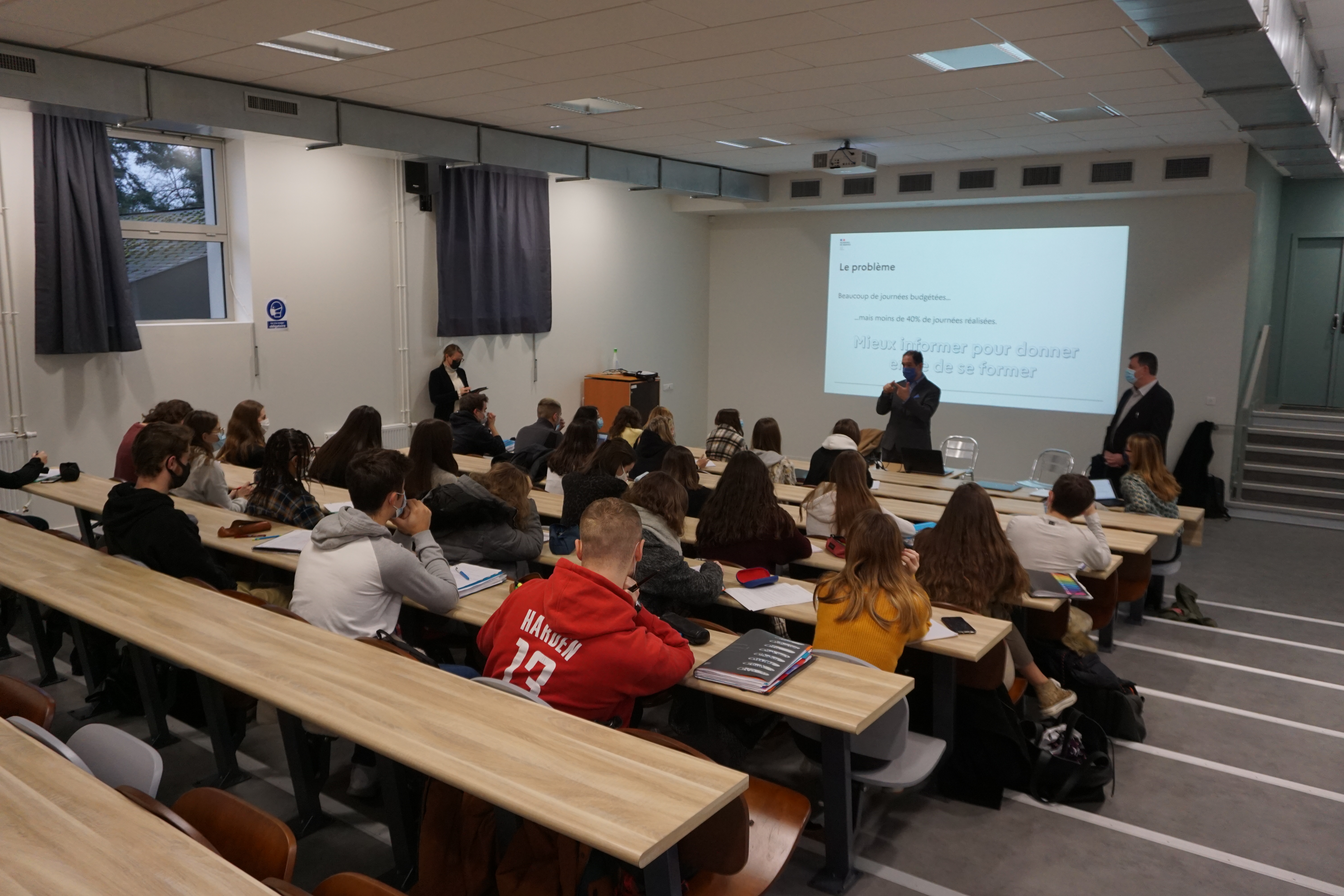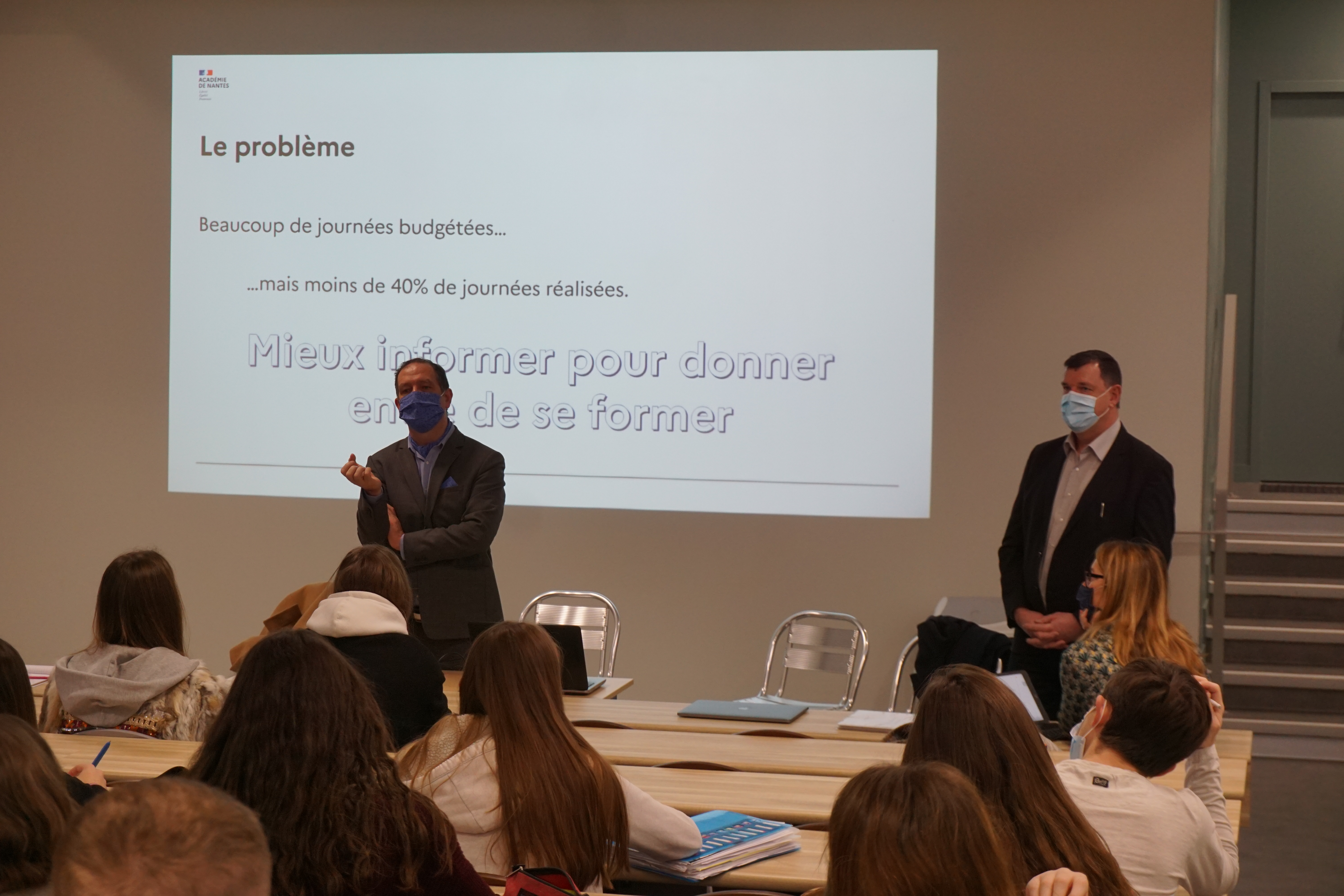 Lundi 7 décembre, les étudiants de BTS com1 ont accueilli dans l’amphithéâtre fraîchement rénové, M. Gaudeul et M. Le Gal, inspecteurs de l’éducation nationale délégués à la formation, venus leur présenter une demande de création de plan de communication pour le rectorat.